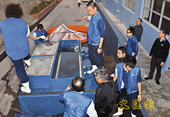 根據(jù)初步檢查結(jié)果,兩尾鱘魚不僅體內(nèi)有炎癥,體外也有不少擦掛傷口。專家會診后制定了“針療+藥物潑灑+水質(zhì)調(diào)整”三路并進的治療方案,一方面按照每周兩次的頻率為鱘魚注射抗生素等針劑,同時每周向繁育池中潑灑2至3次調(diào)配好的粉狀藥物,主要功效都是消炎;刈顬榫o張的水質(zhì)檢測,則指派專人負(fù)責(zé)每日抽樣送檢。
