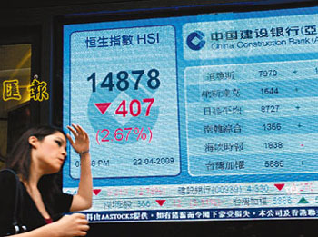 中新網(wǎng)4月23日電 據(jù)香港《文匯報(bào)》報(bào)道,港股經(jīng)周二轉(zhuǎn)勢(shì)后,22日繼續(xù)下跌,終跌破15000點(diǎn)。大市在上午曾一度上升,但午后內(nèi)地上證綜指急插水3%,拖累港股表現(xiàn),淡友趁勢(shì)發(fā)惡,午市大插400點(diǎn)的頹勢(shì),相信嚇怕不少散戶(hù),尤其下午開(kāi)市首15分鐘便挫近260點(diǎn)。恒指收?qǐng)?bào)14878點(diǎn),跌407點(diǎn),跌幅2.7%。