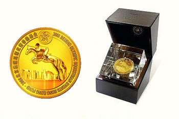 紀(jì)念章以925純銀鍍金鑄造,香港著名平面設(shè)計(jì)師陳幼堅(jiān),以馬術(shù)運(yùn)動員跨躍維港為主題,造工精細(xì),維港旁的建筑物清晰可辨;背面則以區(qū)徽及2008字樣作點(diǎn)綴。每枚紀(jì)念章均附有個別編號的鑒證書、水晶座及木盒,盒面用馬毛制成。
