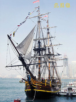 仿照18世紀英國商船建成的“濟民號”,桅高33米,船長42米,船上有木制假大炮、羅盤、駕駛盤等。(香港文匯報圖)