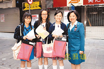 女童軍總會名譽副會長李麗娟與賣旗學生合照。(香港文匯報圖)