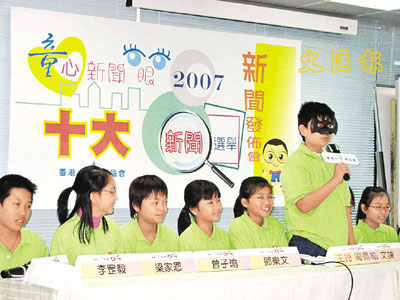 負責舉辦選舉的香港小童群益會第4屆“香港小特首”,上月分別通過表格及網(wǎng)上投票進行“童心新聞眼2007十大新聞選舉”,吸引28996名小四到中三學生參與投票,從30則候選新聞中選出心中的十大新聞,榮獲首3名的新聞依次為“熊貓‘盈盈’、‘樂樂’抵港 慶祝回歸10周年”、“哈利波特大結局 風靡全球”及“嫦娥一號發(fā)射成功 探月夢想逐步成真”,分別取得18172票、16474票及15054票。