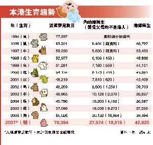 據(jù)香港明報報道,2007年醫(yī)管局共錄得39,182名新生嬰數(shù)字,醫(yī)管局總行政經(jīng)理鄭信恩說,雖然傳統(tǒng)上生仔旺季一向在9月至11月,但今年首個半月公立醫(yī)院生產個案,已明顯較去年同期上升,“去年經(jīng)濟好,市民積極想生育多點,估計今年生育也會多,新生嬰應會超過去年。”