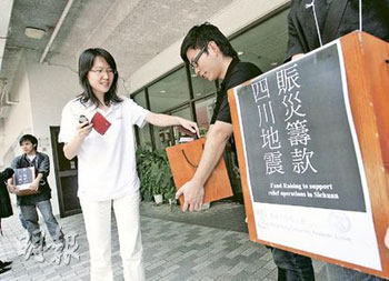 中新網5月15日電 據香港明報報道,四川災情嚴峻,港人紛紛捐款賑災,短短兩日,中聯辦已收到香港各界逾1.3億元捐款。不同界別各出其謀籌款,香港教育界呼吁全港所有中小學生捐10元、教師捐100元賑災。