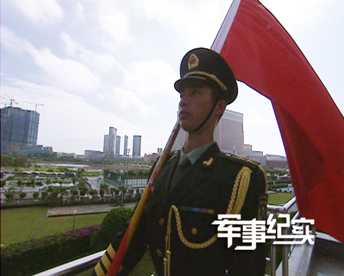 臨近退伍的一天,駐澳門部隊的氹仔軍營里,兩名戰(zhàn)士之間正在進(jìn)行一次特殊的軍旗交接儀式。即將告別澳門部隊的王雨,將陪伴他一年多的軍旗移交到戰(zhàn)友的手里。接過軍旗的是左護(hù)旗手張文斌,從這一刻起,張文斌將承擔(dān)起老旗手交付的千鈞重?fù)?dān),將八一軍旗高高擎起在澳門的土地上。