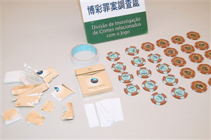 中新網3月27日電 據澳門日報報道,內地豪客通過沓碼仔兌換數百萬元籌碼豪賭,兩名沓碼仔乘豪客沉迷賭博期間施怪招偷籌碼,利用貼有雙面膠紙的煙盒,在5個多小時內成功偷走客人近300萬元籌碼。司警通過閉路電視監視拘捕兩疑人,搜獲超過每個10萬元、總值290萬元的籌碼。