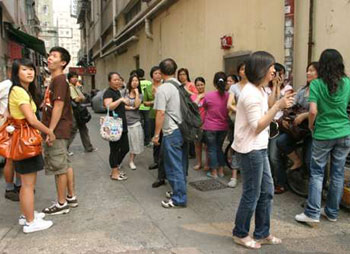 五月十二日晚,香港市民在街頭觀看新聞,關注四川等地發生的地震消息。當天下午,香港天文臺也接獲多名市民的報告,表示感覺到一次震動。 中新社發 洪少葵 攝