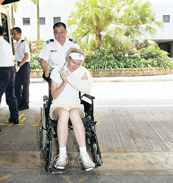 外籍婦人爬山時被6寸長啡色蜘蛛咬傷左掌背,送院治理時仍面露微笑,傷勢并無大礙。(圖片來源:明報)