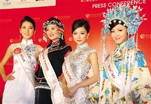 28日國際小姐候選會見傳媒,各佳麗以自身的國家地區(qū)特色服飾現(xiàn)身,奢華、高貴、性感,各具特色,各有韻味。63位麗人站臺時,會場儼如一場服飾嘉年華,也體現(xiàn)國際小姐的國際性。呂蓉茵則決定收起美好身段,以一襲金襯藍(lán)的粵劇戲服出場,同樣謀殺現(xiàn)場相機(jī)的內(nèi)存。