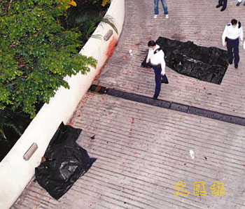有街坊聽到一聲巨響后,發現一男一女倒伏在芷葵樓一條緊急車輛通道,兩人相距約3米,大驚之下致電報警。救護員到場,證實兩人頭爆肢折當場死亡,警員事后以帆布架遮蓋尸體,然后上樓追查兩人墮樓位置。