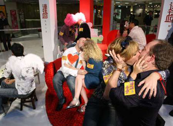 在鎂光燈的閃爍下,五對來自不同國家的情侶,坐上獨特的“愛情連椅”,他們要在眾目睽睽下,用各異的方式吻自己的愛侶,持續2分14秒。圍觀市民大感興趣,摒住呼吸觀賞現場的熱吻。