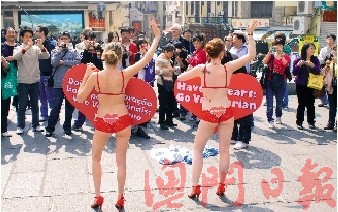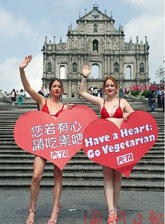 兩名性感內衣女郎12日中午12時現身旅游旺區——大三巴牌坊,兩人手持心形的“您若有心,請吃素吧”標語。兩人是善待動物組織成員,來到澳門主要傳遞“素食對身心均有益處”和“吃素是對我們自己、動物及地球最好的情人節禮物”等訊息。