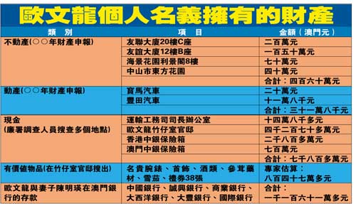 據(jù)澳門日?qǐng)?bào)報(bào)道,澳門廉署首席調(diào)查員馮伯恩經(jīng)法庭批準(zhǔn),透過計(jì)算機(jī)輔助披露歐文龍以個(gè)人名義及透過家人擁有的財(cái)產(chǎn)。歐文龍財(cái)產(chǎn)中,主要由動(dòng)產(chǎn)、不動(dòng)產(chǎn)、有價(jià)值物品及澳門銀行存款組成,從物業(yè)登記處數(shù)據(jù)以及廉署在歐文龍司長(zhǎng)辦公室、官邸及銀行保險(xiǎn)箱中搜獲的現(xiàn)金,涉及的款項(xiàng)逾一億元。