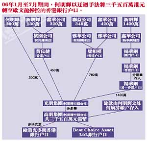 至去年一至七月期間,何明輝向歐文龍交付一筆三千五百萬港元款項,手法顯得更為小心及迂回。何明輝將三千五百萬懷疑賄款分為七筆,分別透過其本人及其妹妹、楊華鋼、黃良健、梁相模、新明輝、鑫華公司、聯益公司、雅華公司等銀行賬戶,經多重轉帳清洗后,方匯入由何明輝開設的光明集團香港銀行賬戶內,由光明集團賬戶匯至何明輝所操控的另一空殼公司高明集團銀行賬戶,再逐筆以支票最終存入由歐文龍操控的香港銀行賬戶內。過程中,部分懷疑賄款經七層清洗,方最終進入由歐文龍操控的香港銀行賬戶內。