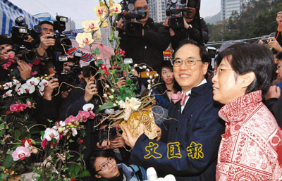 中新網(wǎng)2月13日電 農(nóng)歷新年靈鼠獻(xiàn)瑞,香港今年“鼠”不簡單。香港特首曾蔭權(quán)亦“鼠至福到”,“假豬真鼠”金孫女一抱上手,可愛笑臉即逗得曾蔭權(quán)這個(gè)“新科”爺爺喜上眉梢,情不自禁流露出滿足的甜笑。