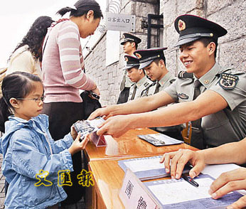 中新網(wǎng)4月28日電 據(jù)香港文匯報(bào)報(bào)道,五一勞動(dòng)節(jié)當(dāng)天,市民再次有機(jī)會(huì)與解放軍駐港部隊(duì)作近距離接觸。解放軍駐港部隊(duì)27日晨在添馬艦、石崗及槍會(huì)山軍營派發(fā)一共8000張門票,吸引大批市民到場(chǎng)輪候,部分人更在取得門券后再排隊(duì)領(lǐng)取。