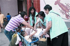 全國政協十四日舉行為四川汶川災區捐助活動。全國政協副主席、澳門中華總商會會長馬萬祺,全國政協常委何鴻燊等紛紛捐款。圖為全國政協委員馬有禮的夫人顏婉明(右)女士代為捐贈善款給中華慈善總會。 中新社發 徐長安 攝