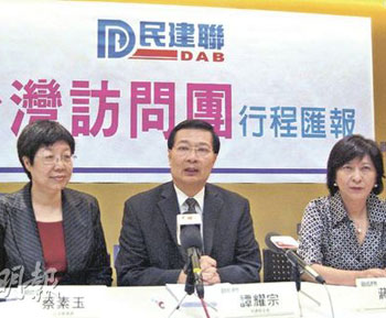 香港民建聯(lián)主席譚耀宗(中)總結(jié)訪臺行程。左為蔡素玉,右為蔣麗蕓。(圖片來源:明報)