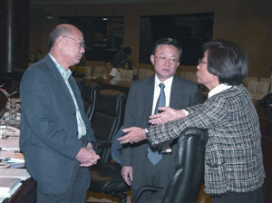 圖:曹其真、徐偉坤、鄭志強(qiáng)交換意見(jiàn)。(圖片來(lái)源:澳門(mén)日?qǐng)?bào))
