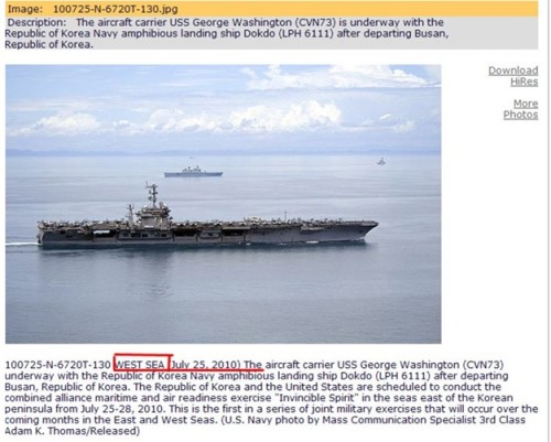 記者于7月28日再次登錄美國海軍官方網站,發現之前被標為拍攝于“西!(中國稱“黃海”)并在7月27日被刪除的照片,已經再度被上傳到網站上,而其標注的地點已經被更正為“日本海”。
