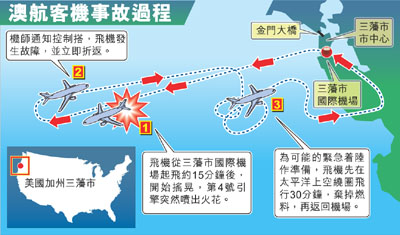 報道稱,機師隨即關掉故障引擎,并將機上燃油丟棄到海上,防止飛機過重;然后通知舊金山的機場要求緊急降落。事后證實,機上4個勞斯萊斯制造的引擎中,4號引擎發生爆炸。