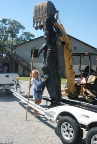 在南卡羅來納州摩爾特里湖中,48歲的瑪拉·克里斯蒂安與這條巨大無比的可怕生物爭斗了兩個小時。22毫米口徑的獵槍根本無法制服它,瑪拉就用鋒利的尖刀切斷了野獸的脊柱。最終,她終于可以在起吊機前細細打量這條令人難以置信的鱷魚。