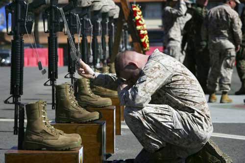 資料圖片:圖為一名駐伊美軍士兵正悼念陣亡的戰友。