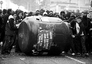 在里昂等城市,許多中學(xué)生放火焚燒汽車。在法國西北部,19日上午也有一所學(xué)校起火,起火原因是很明顯的縱火。