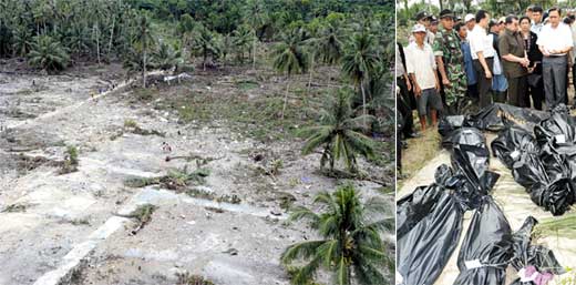 海底強震引起的致命海嘯發生兩天后,傷亡人數持續增加。最靠近震中、受創最深的明打威島煉,救難人員之前由于氣候惡劣無法登陸,裝載16噸的帳篷、藥品、食物和衣物的貨機,總算于27日下午抵達。由于挖墓的人力不足,仍可見到遺體散布在海邊及路邊。