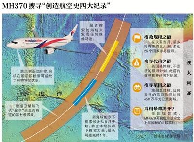 不僅花費創紀錄,澳大利亞副總理沃倫·特拉斯26日說,搜尋MH370已遍及450萬平方公里海域,這是“歷史上范圍最大的搜尋行動”。