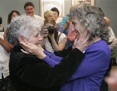 16日,一對共同生活了34年的女同性戀人在加州合法結婚。