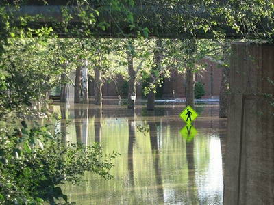 愛荷華市的洪水水位仍在上升,圖為該市大學藝術學院校園道路指示牌。