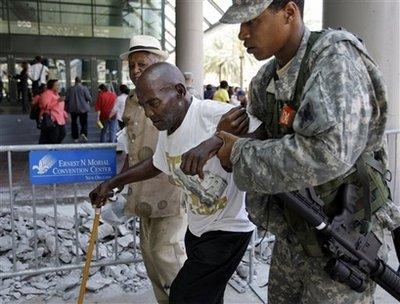 美國民衛隊士兵幫助一名老者撤離。