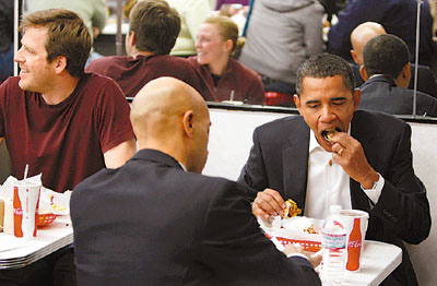 經(jīng)過一輪哄動,奧巴馬亦無忘記此行目的,向職員詢問:“食物在哪?”引起全場大笑。最后他與芬蒂點(diǎn)了辣味熱狗及炸芝士條。奧巴馬在進(jìn)食期間與其他客人交談,又向侍應(yīng)索取芝士條調(diào)味。