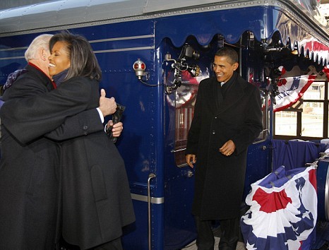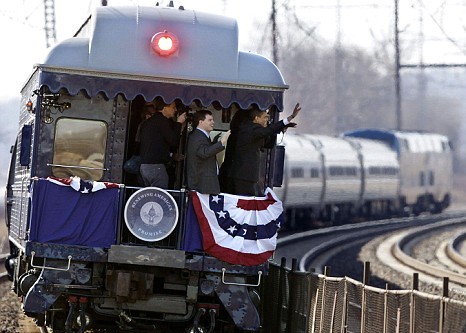 奧巴馬在乘坐專列由費城啟程前往首都華盛頓途中,開始總統(tǒng)就職的一系列活動。當天也是其妻子米歇爾45歲的生日,他們在火車上慶祝,兩人沿途又向群眾揮手,很多人夾道歡呼,有人舉起寫上“米歇爾生日快樂”的標語牌。