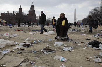 日前美國將使用衛(wèi)星在空中拍攝到華盛頓國家廣場照片,和奧巴馬總統(tǒng)就職后的進行對比。從照片上可以看到在就職典禮當日,國家廣場上覆蓋了白色垃圾,這些垃圾大部分是宣傳紙、報紙、塑料瓶子、食物包裝紙、一次性咖啡杯,甚至還有美國國旗。