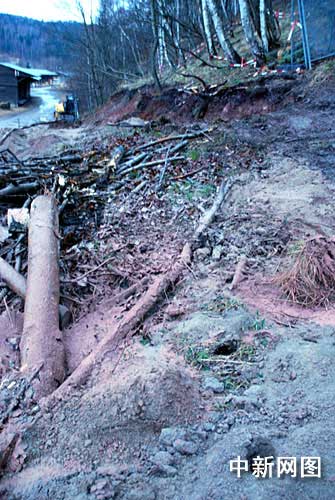 冷風(fēng)吹動(dòng)紅白相間的警戒帶,推土機(jī)挖掘出的一條大約3米寬的斜坡路旁邊橫七豎八地倒臥著被伐倒的樹木,路邊和路中間“探寶”留下的的鉆孔清晰可見(jiàn)。斜坡上一塊大約10多平方米的平地上連著至少鉆了4個(gè)洞孔,每個(gè)間隔只有60厘米,四周散落著淡紅色的巖石粉末。