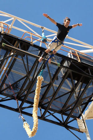 南非擁有世界上最高的蹦極點,熱衷蹦極的人們常常在南非找刺激。近日,一位另類的蹦極手創下了蹦極運動的新紀錄:37歲的葡萄牙男子卡爾·迪奧尼西奧用1.85萬個安全套做成30米長的彈性繩,代替傳統尼龍繩跳下蹦極臺,將“生死一線牽”的感覺發揮到極致。