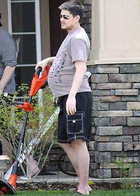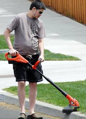 留著胡子的他盡管懷孕,仍堅持勞動,修整家里的草坪。