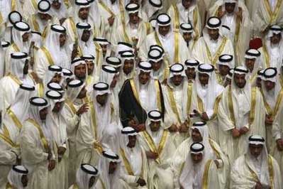 身著傳統服裝的沙特新郎,穿黑衣者為利雅得省長撒拉曼親王。(圖片來源:國際在線)