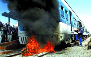 阿根廷電視臺(tái)畫面上,布宜諾斯艾利斯西郊梅洛站停靠的一列火車冒著黑煙,火焰吞沒整列火車。在鄰近梅洛的卡斯特拉爾站,乘客向售票處投擲石塊,站在鐵軌上阻止列車進(jìn)站。