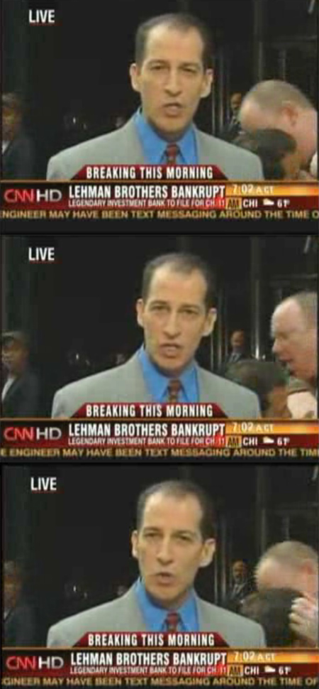 據(jù)韓國《朝鮮日報》報道,14日凌晨(當?shù)?美國有線電視頻道CNN以緊急新聞的形式報道了雷曼兄弟公司向法院申請破產保護的消息。該新聞是以在直播間與趕赴紐約時代廣場雷曼公司總部的CNN現(xiàn)場記者直播連線的方式播出的。