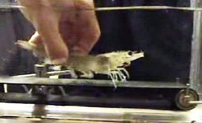科學(xué)家為試驗(yàn)蝦在尋找食物時(shí)最遠(yuǎn)可以“旅行”的距離,日前將一只用作試驗(yàn)的蝦放在一個(gè)水中小型跑步機(jī)上。這只蝦隨后在跑步機(jī)上“奔跑”起來(lái),速度竟然高達(dá)每分鐘20多米。而為了尋找到食物,它可以在跑步機(jī)上“奔跑”長(zhǎng)達(dá)3個(gè)多小時(shí)。