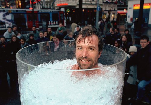 霍夫說:“我當時和某人在公園散步,看到了冰。我突然冒出個想法:要是站到冰中會怎樣呢?我非常想試一下。于是,我脫掉衣服,在里面站立了30秒。出來后,我有一股強烈的愉悅感。從那以后,我每天都這樣做。”
