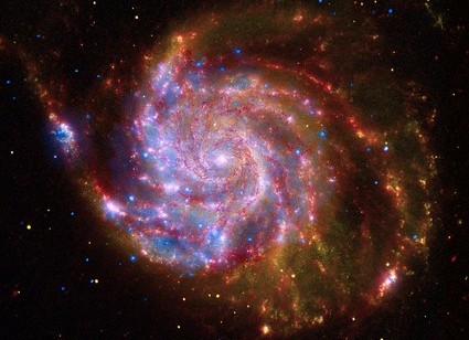 中新網2月12日電 據美聯社11日報道, 美國宇航局日前發布了“斯皮策”望遠鏡的紅外觀測圖像。圖像顯示,風車星系中心大范圍區域像藍色漩渦,而環繞星系的外圈卻呈現出奇特的珊瑚紅色。