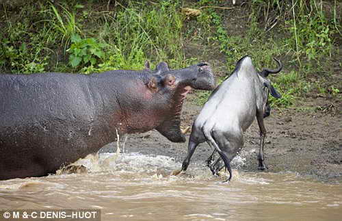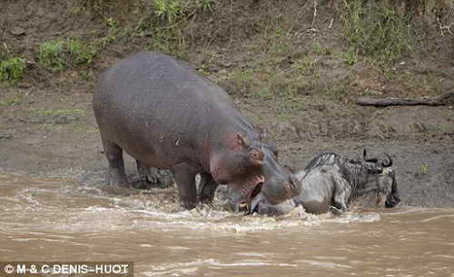 河馬攻擊黑尾牛羚不是為了充饑,事實上,河馬是食草動物。那頭看起來心情很差的河馬攻擊黑尾牛羚可能是因為自己的領地遭到侵犯而感到憤怒。(蕭熙)