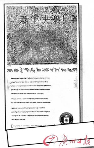 CIA還首度以中文“新年快樂”向華裔民眾拜年,廣告畫面上還配有一只威風凜凜的老虎,中國味濃厚,備受矚目。