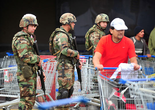 雖然智利政府已開始免費發放食品,但由于大規模救援遲遲未能展開,2月28日和3月1日,康塞普西翁兩度發生大規模哄搶現象,搶掠者甚至放火燒了一家超市。