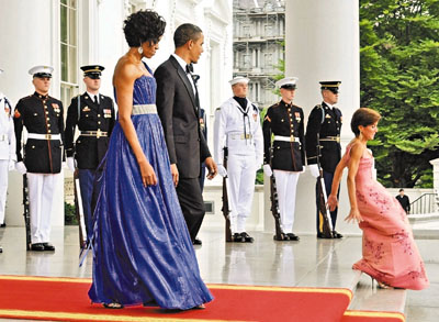 中新網(wǎng)5月21日電 據(jù)香港《文匯報》報道,美國總統(tǒng)奧巴馬19日在白宮設(shè)宴款待來訪的墨西哥總統(tǒng)時發(fā)生一段小插曲,白宮的禮儀官準(zhǔn)備迎接貴賓時,忽然跌一跤,整個人坐在階梯上,受驚的她立刻站起來,開玩笑警告攝影記者不要拍照。