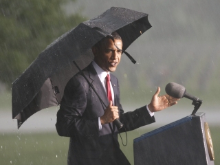 5月31日下午,奧巴馬準(zhǔn)備在林肯國(guó)家公墓發(fā)表國(guó)殤日演說(shuō),正當(dāng)他站上講臺(tái)之際,天空中忽然下起大雨,一時(shí)間雷電交加,風(fēng)也狂吹,一旁的旗幟不停左右搖擺。由于雷雨越下越大,完全沒(méi)有趨緩,奧巴馬撐著一把大黑傘,宣布演說(shuō)暫時(shí)取消。